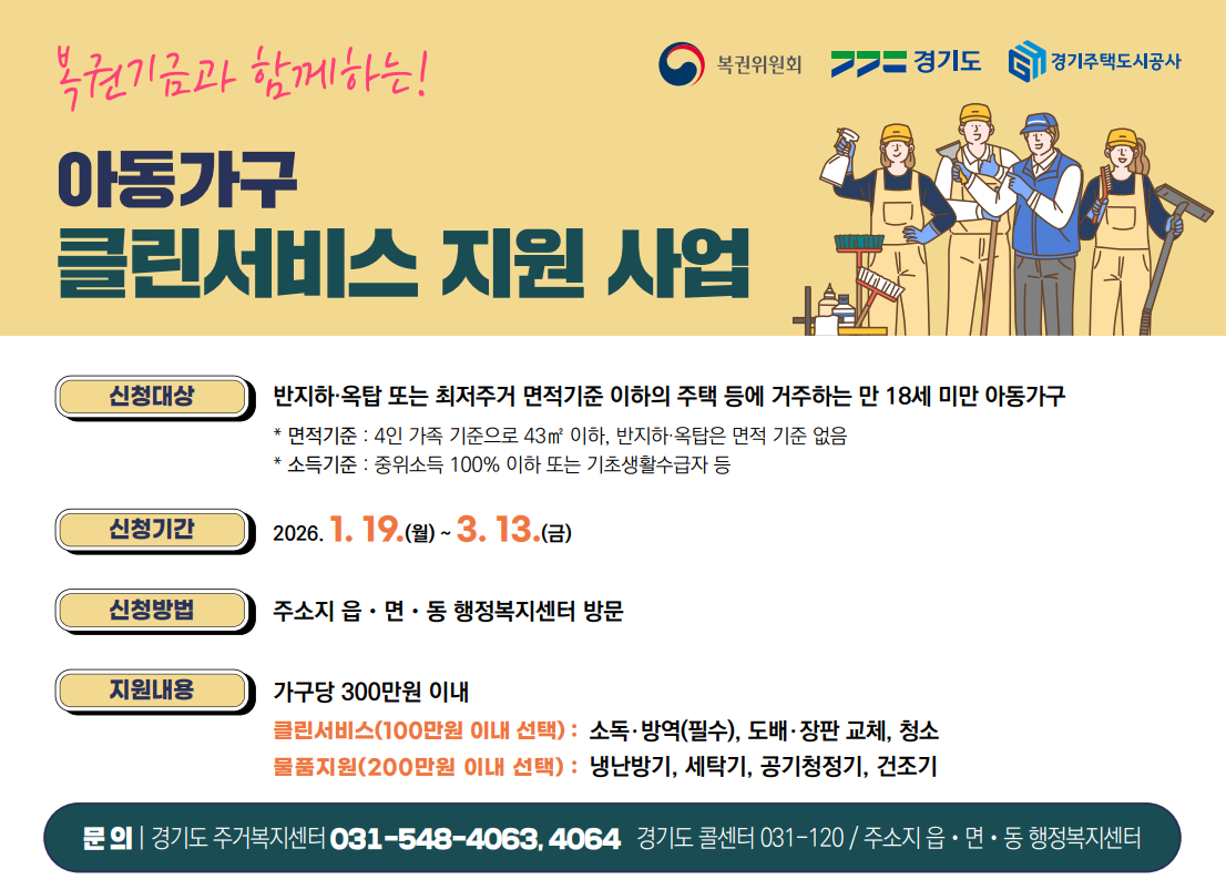 복권기금과 함께하는 아동주거빈곤가구 클린서비스 지원 사업 안내 신청기간: 2026년 1월 19일(월) ~ 3월 13일(금) 신청 방법: 귀하의 주소지 읍/면/동 행정복지센터로 방문하여 신청해 주시기 바랍니다.