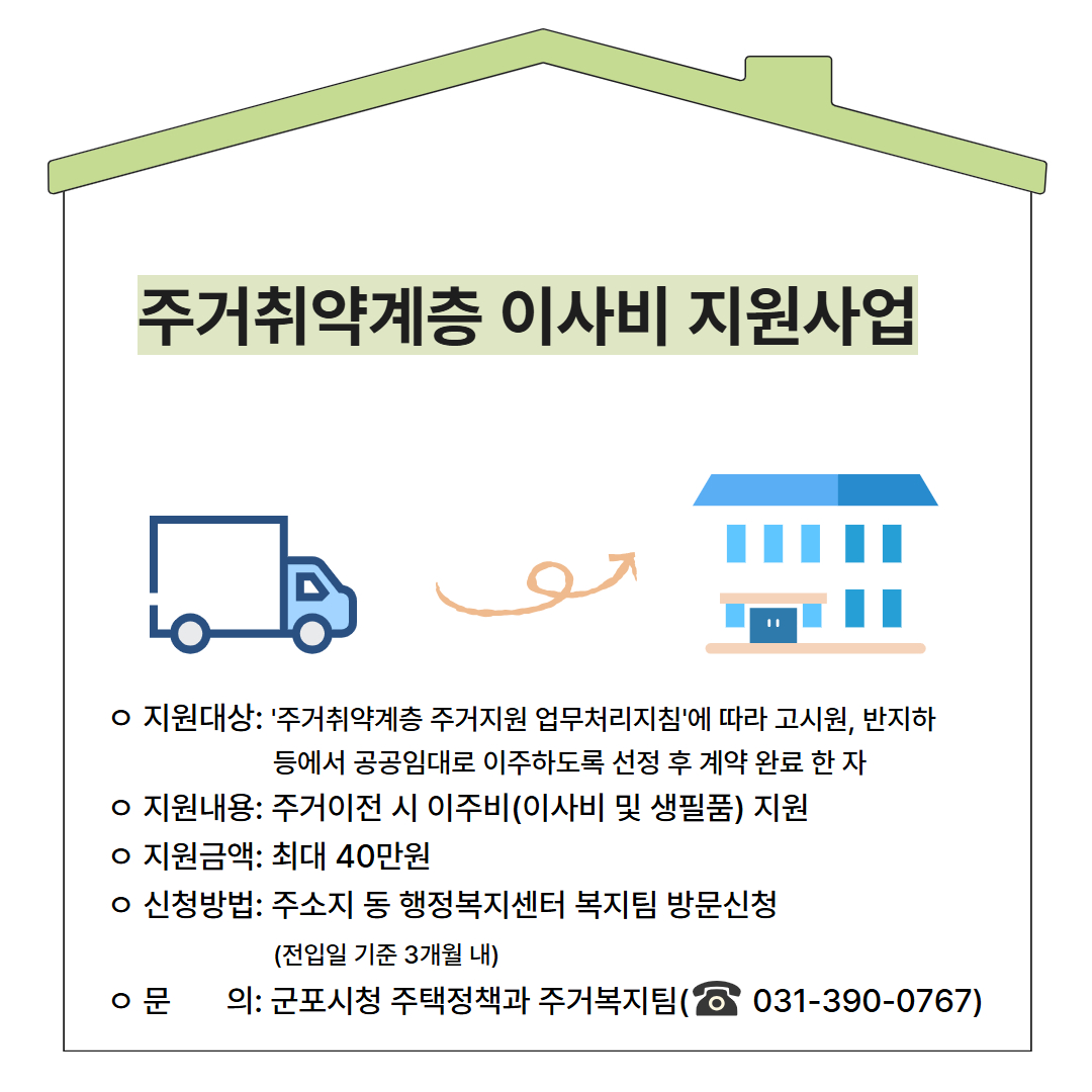 ○사업명: 주거취약계층 이사비 지원사업 ○지원대상: ‘주거취약계층 주거지원 업무처리지침’에 따라 고시원, 반지하 등에서 공공임대로 이주하도록 선정 후 계약 완료 한 자 ○지원내용: 주거이전 시 이주비(이사비·생필품) 지원 ○지원금액: 최대 40만원 ○신청방법: 주소지 동 행정복지센터 복지팀 방문신청 (전입일 기준 3개월 내) ○문의: 군포시청 주택정책과 주거복지팀 (☎ 031-390-0767)